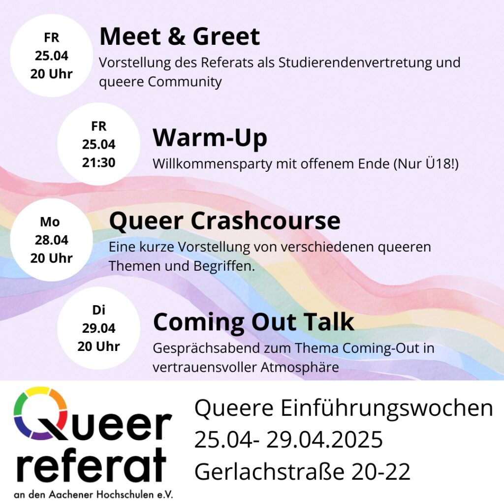 Queerreferat an den Aachener Hochschulen e.V. Sun, 12 Oct 2025 16:28:41 +0000 de hourly 1 https://wordpress.org/?v=6.7.2 /wp-content/uploads/2023/12/logo-150x150.png Queerreferat an den Aachener Hochschulen e.V. 32 32 Queere Einführungswoche WiSe 2025/26 /2025/10/12/queere-einfuehrungswoche-wise-202526/ /2025/10/12/queere-einfuehrungswoche-wise-202526/#respond Sun, 12 Oct 2025 16:21:12 +0000 /?p=5849 Wir starten bald ins neue Semester und wie jedes mal, gibt es bei uns die Einführungswochen mit ein paar spannenden Veranstaltungen.