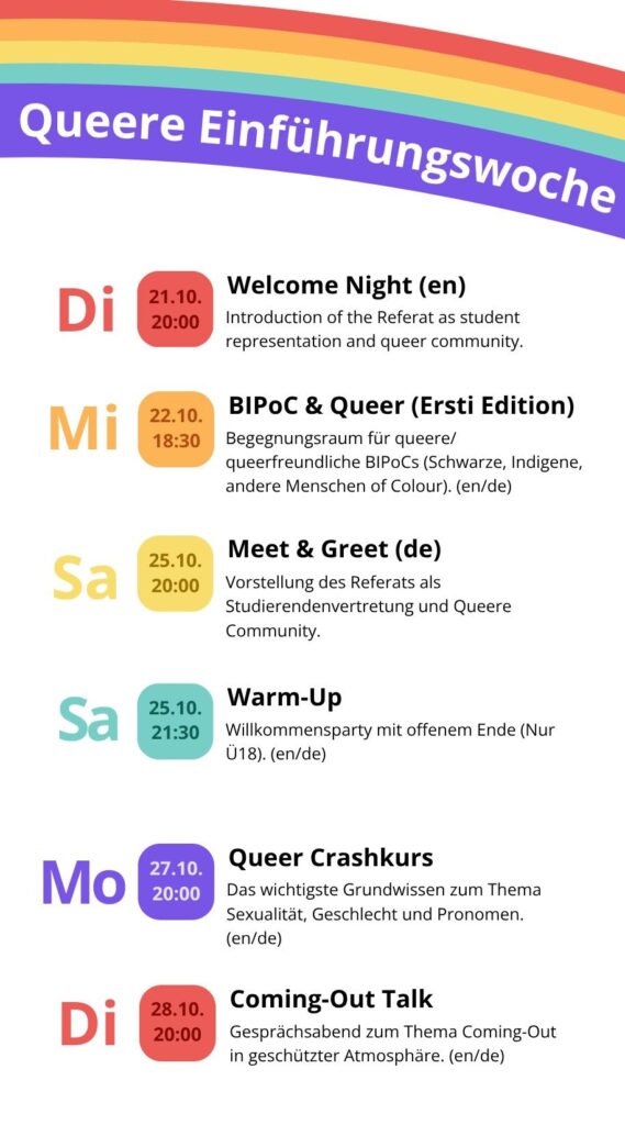 Bei unserem Meet & Greet stellen wir allen die noch nie (oder noch nicht so häufig) da waren das Referat und unsere queere Community vor. Kommt gerne vorbei und nutzt diese Chance uns und neue Menschen kennenzulernen. Diese Veranstaltung gibt es zunächst auf englisch und danach auf deutsch.