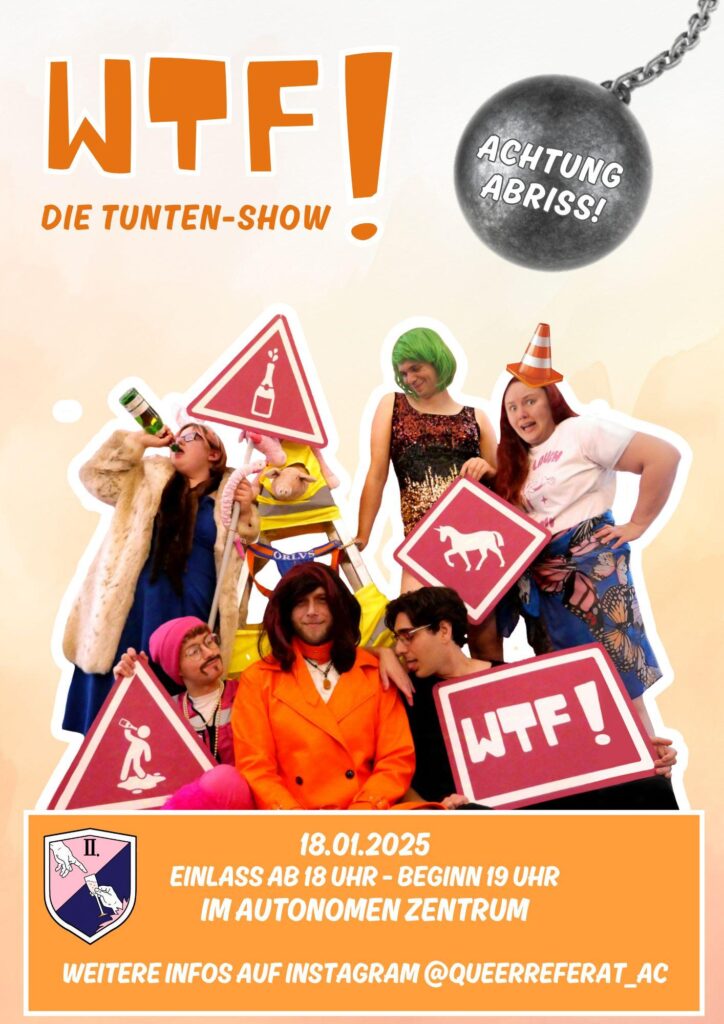 | WTF – Die Tuntenshow Mit anschließender Aftershowparty! | 18.01.2025 Einlass 18 Uhr Beginn 19 Uhr Ende 23:30 Uhr Party: 00 – 03 Uhr | Autonomes Zentrum Aachen Hackländerstraße 552064 Aachen | Eintritt auf Spendenbasis. |
